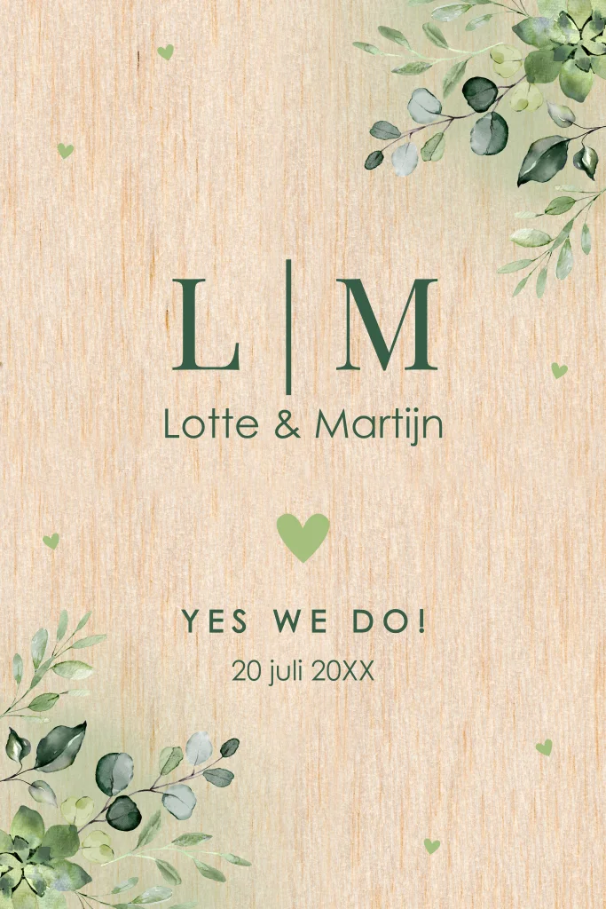 Stijlvolle trouwkaart op echt hout botanisch met waterverf takjes bladeren groen.