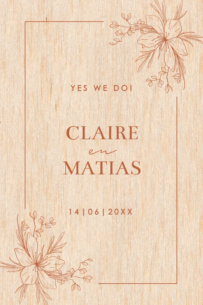 Trouwkaart op echt hout met bloemenkader. Let op, dit is een houten kaart: • Hout is een natuurlijk product, dus ieder kaartje is uniek. • Het is niet mogelijk om de kleur 'wit' te drukken.