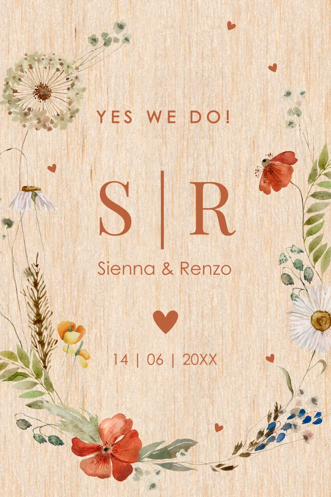 Trouwkaart op echt hout met watercolour veldbloemen. Let op, dit is een houten kaart: • Hout is een natuurlijk product, dus ieder kaartje is uniek. • Het is niet mogelijk om de kleur 'wit' te drukken.
