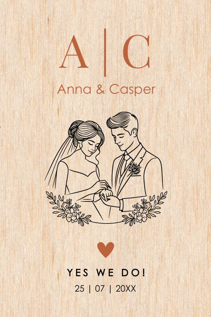 Romantische trouwkaart op echt hout met lijntekening koppel.
