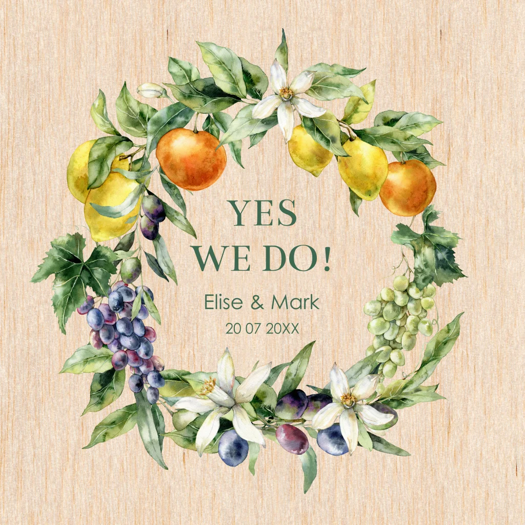 Trouwkaart op echt hout Mediterraans fruit
