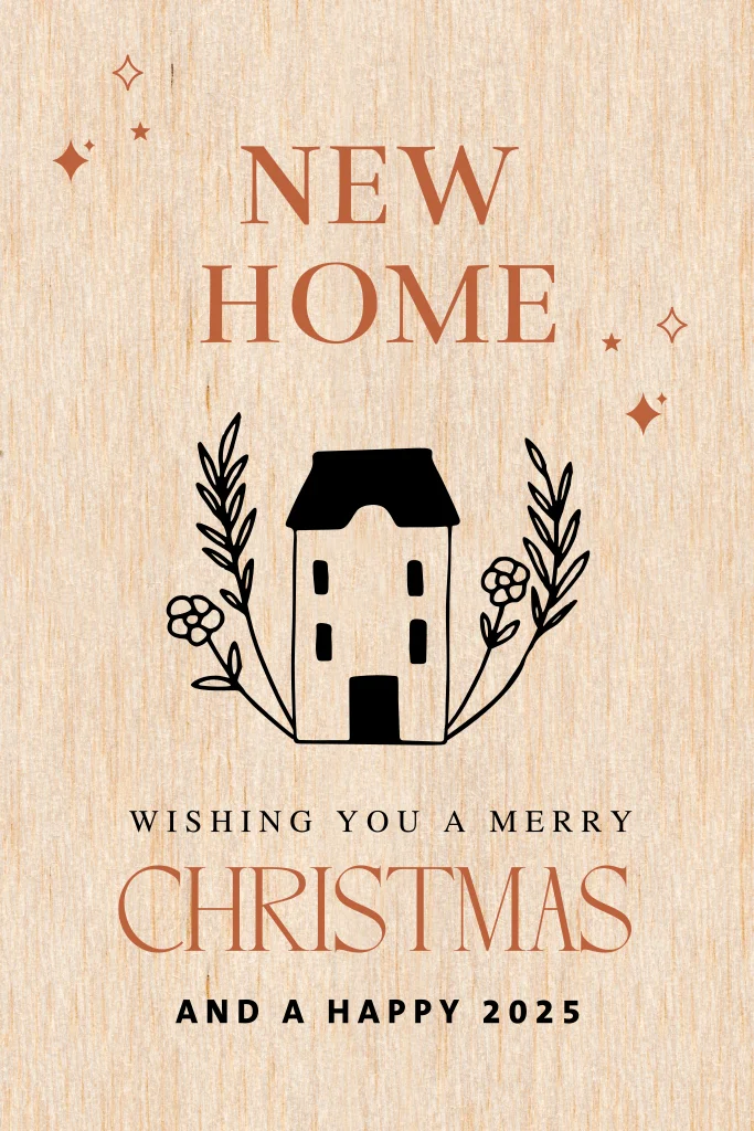 Kerst-verhuiskaart op echt hout met huisje getekend. Let op, dit is een houten kaartje: • Hout is een natuurlijk product, dus ieder kaartje is uniek. • Het is niet mogelijk om de kleur 'wit' te drukken.