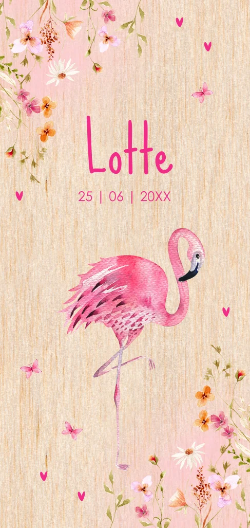 Geboortekaartje echt hout met flamingo roze bloemen