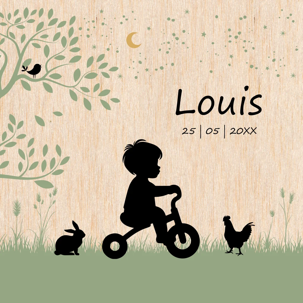 Geboortekaartje op echt hout voor een jongen met silhouet.