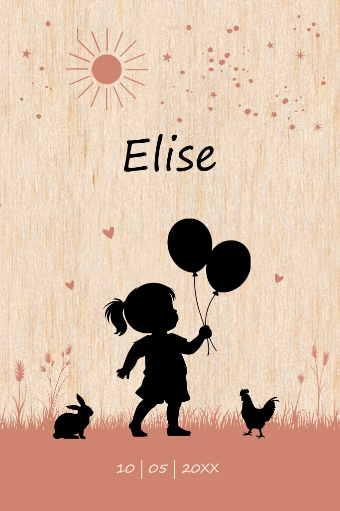 Geboortekaartje voor een meisje met silhouet op echt hout.