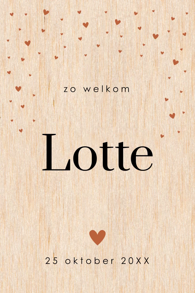 Geboortekaartje voor een meisje op echt hout met hartjes. Let op, dit is een houten kaartje:
