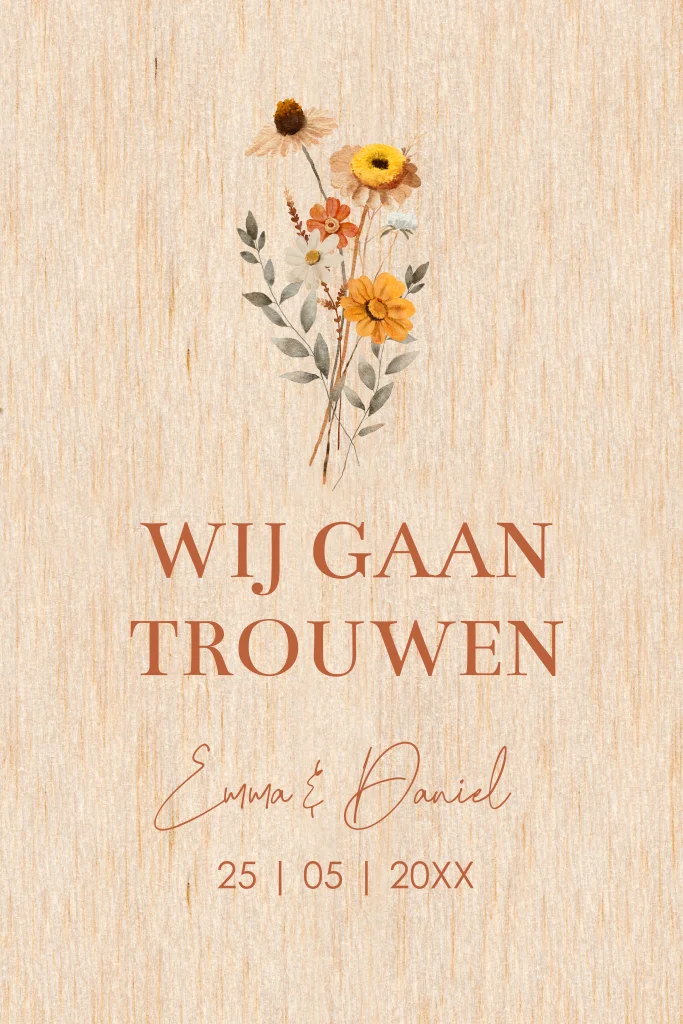 Trouwkaart op echt hout met bloemenboeket. Let op, dit is een houten kaart: • Hout is een natuurlijk product, dus ieder kaartje is uniek. • Het is niet mogelijk om de kleur 'wit' te drukken.