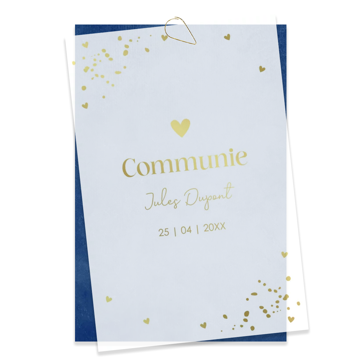 Communiekaart op kalkpapier met goudfolie. Let op, dit is maar 1 kaart. Kaart 2 (achterkaart) dien je erbij te bestellen. Je besteld dus altijd 2 kaarten in je winkelmandje. Dit kaartje is gedrukt op semi transparant papier wat een heel uniek en bijzonder effect geeft. Deze kaart kan alleen aan de voorzijde gedrukt worden. Gebruik geen ‘wit’ of andere hele lichte kleuren in je design, deze zal je (haast) niet zien. Tip: plaats dit kalkpapier kaartje met een paperclip vast aan de trouwkaart.