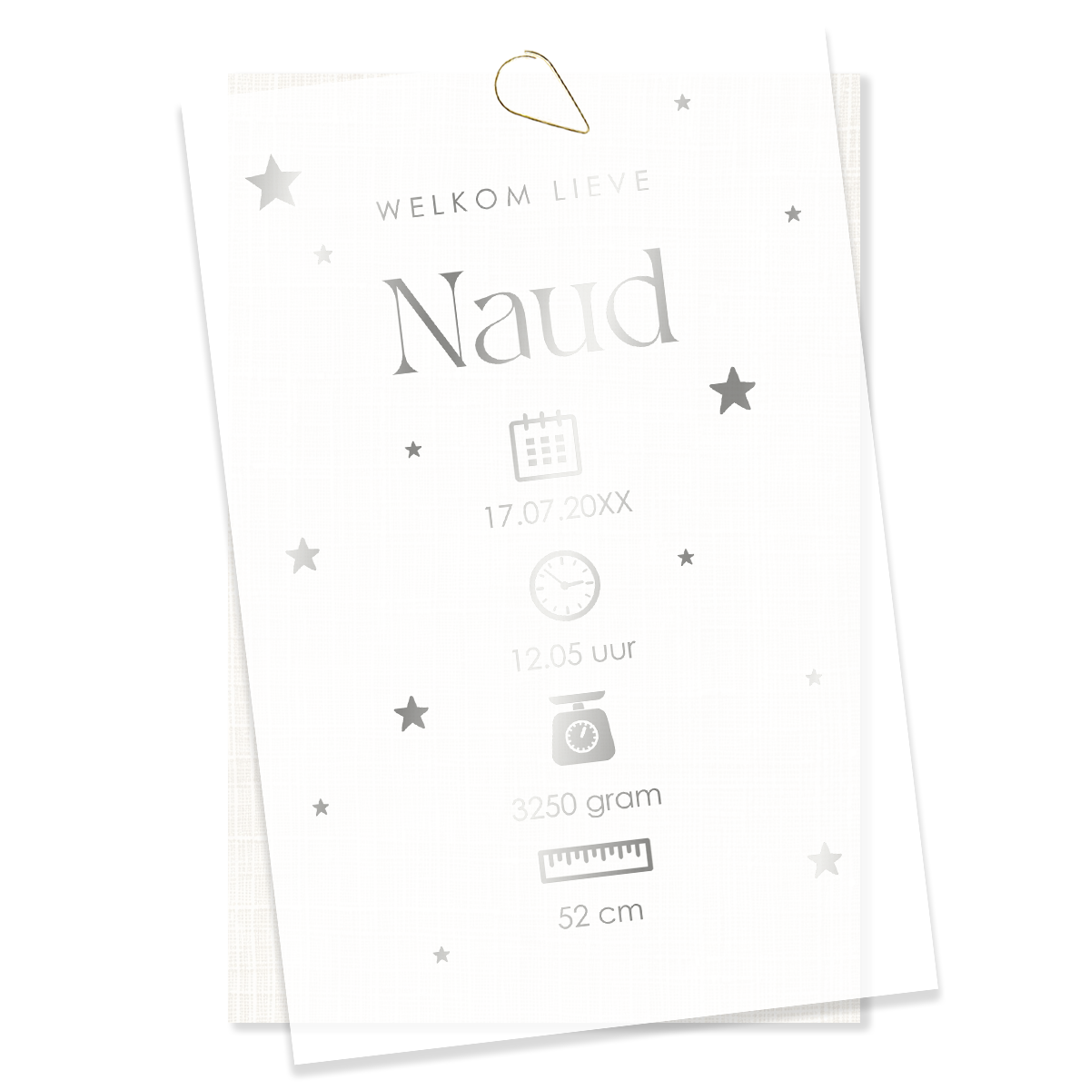 Geboortekaartje op kalkpapier voorkant met geboorte symbolen en sterren. Dit kaartje is gedrukt op semi transparant papier wat een heel uniek en bijzonder effect geeft. Deze kaart kan alleen aan de voorzijde gedrukt worden. Gebruik geen ‘wit’ of andere hele lichte kleuren in je design, deze zal je (haast) niet zien.