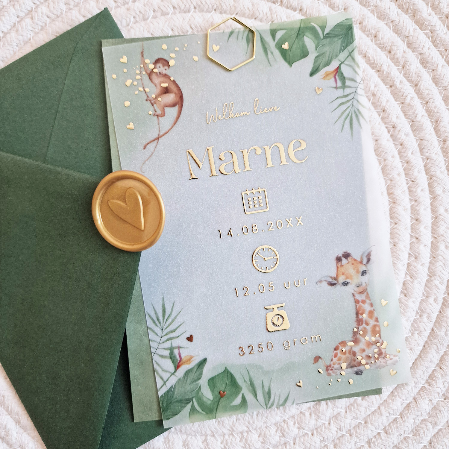 Geboortekaartje voor een jongen op kalkpapier met jungle dieren lief aapje, giraffe, geboorte-icoontjes en goudfolie. Dit kaartje is gedrukt op semi transparant papier wat een heel uniek en bijzonder effect geeft. Deze kaart kan alleen aan de voorzijde gedrukt worden. Gebruik geen ‘wit’ of andere hele lichte kleuren in je design, deze zal je (haast) niet zien.