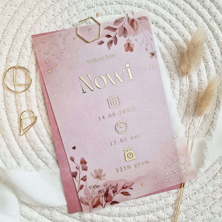 Deel 1 - kalkpapier voorkant geboortekaartje bloemen met goudfolie