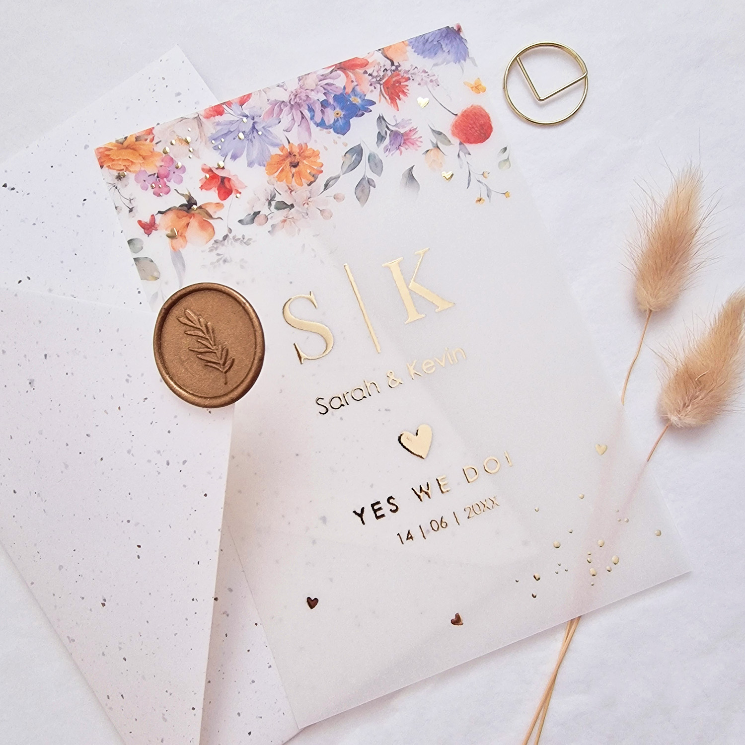 Trouwkaart op kalkpapier met verschillende kleuren watercolour bloemen en goudfolie. Dit kaartje is gedrukt op semi transparant papier wat een heel uniek en bijzonder effect geeft. Deze kaart kan alleen aan de voorzijde gedrukt worden. Gebruik geen ‘wit’ of andere hele lichte kleuren in je design, deze zal je (haast) niet zien. Tip: plaats dit kalkpapier kaartje met een paperclip vast aan de trouwkaart.