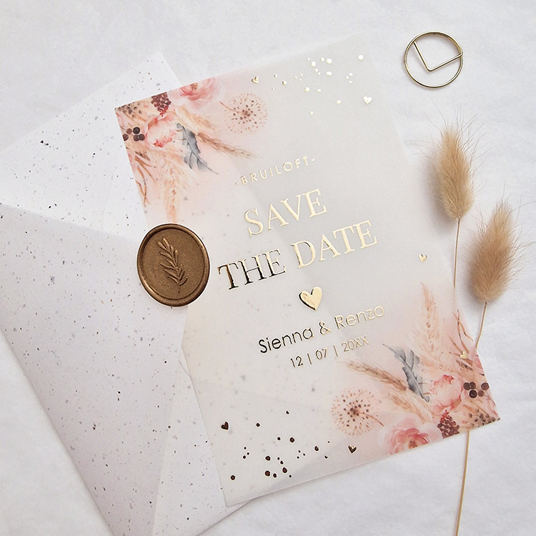 Save the Date kaart kalkpapier bohemian bloemen goudfolie