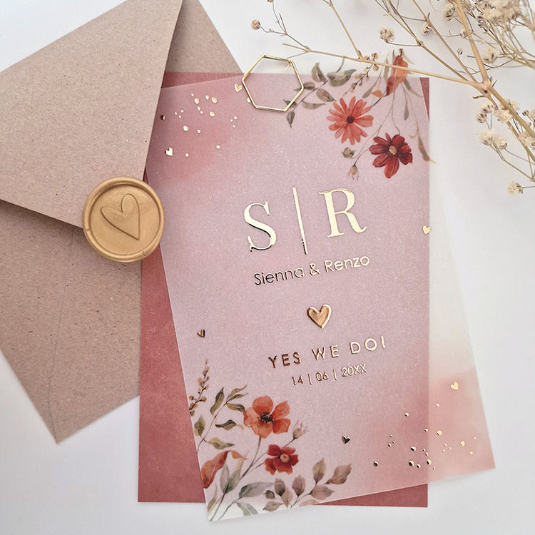 Trouwkaart op kalkpapier met watercolour bloemen pastelroze en goudfolie. Dit kaartje is gedrukt op semi transparant papier wat een heel uniek en bijzonder effect geeft. Deze kaart kan alleen aan de voorzijde gedrukt worden. Gebruik geen ‘wit’ of andere hele lichte kleuren in je design, deze zal je (haast) niet zien. Tip: plaats dit kalkpapier kaartje met een paperclip vast aan de trouwkaart.