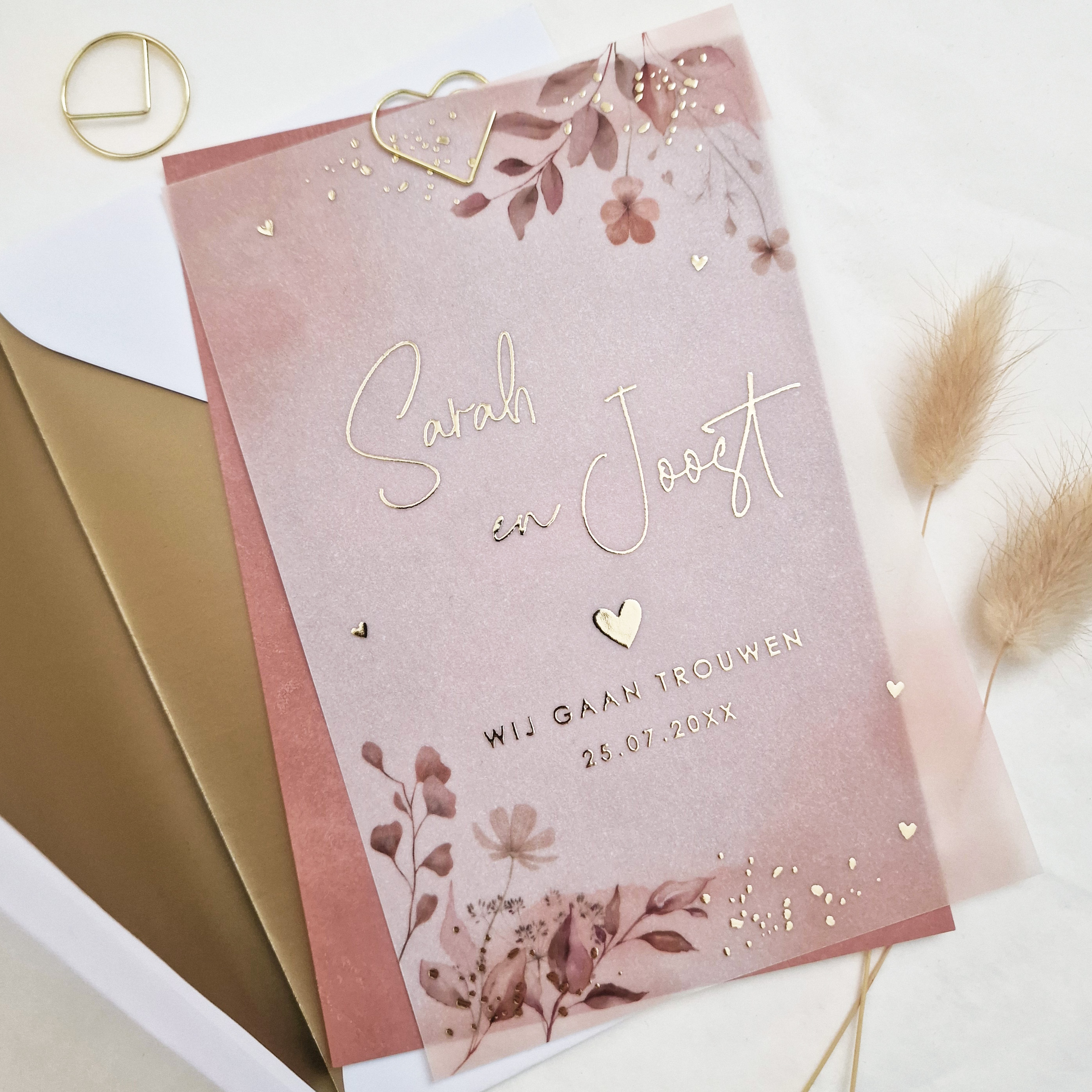 Trouwkaart op kalkpapier met roze watercolour bladeren, bloemen beige en goudfolie. Let op, dit is maar 1 kaart. Kaart 2 (achterkaart) dien je erbij te bestellen. Je besteld dus altijd 2 kaarten in je winkelmandje. Dit kaartje is gedrukt op semi transparant papier wat een heel uniek en bijzonder effect geeft. Deze kaart kan alleen aan de voorzijde gedrukt worden. Gebruik geen ‘wit’ of andere hele lichte kleuren in je design, deze zal je (haast) niet zien. Tip: plaats dit kalkpapier kaartje met een paperclip vast aan de trouwkaart.