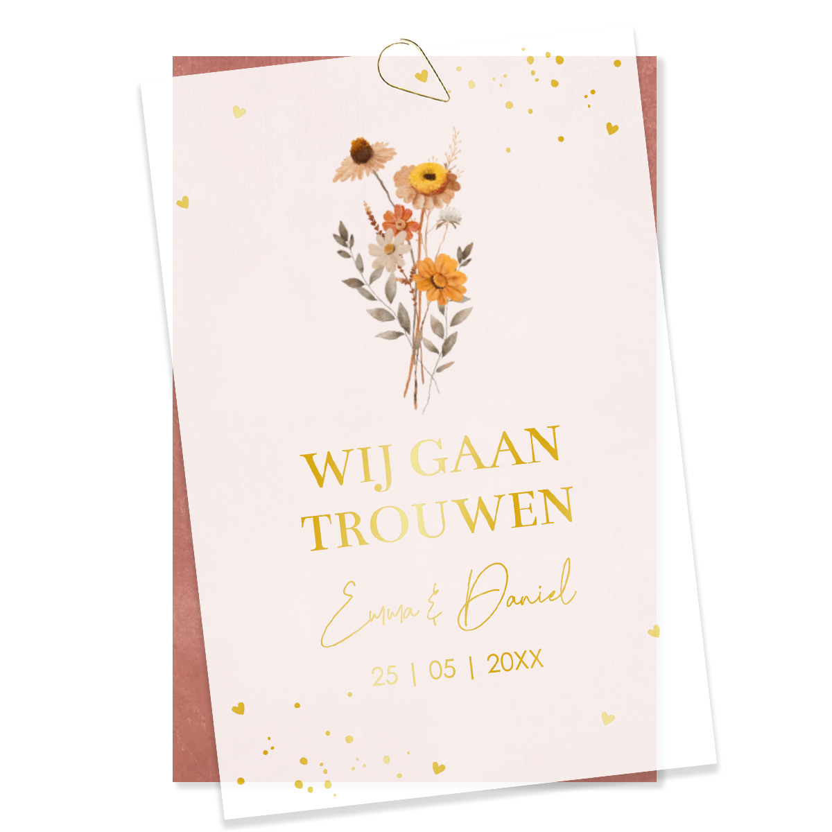 Trouwkaart op kalkpapier met bloemenboeket en goudfolie. Let op, dit is maar 1 kaart. Kaart 2 (achterkaart) dien je erbij te bestellen. Je besteld dus altijd 2 kaarten in je winkelmandje. Dit kaartje is gedrukt op semi transparant papier wat een heel uniek en bijzonder effect geeft. Deze kaart kan alleen aan de voorzijde gedrukt worden. Gebruik geen ‘wit’ of andere hele lichte kleuren in je design, deze zal je (haast) niet zien. Tip: plaats dit kalkpapier kaartje met een paperclip vast aan de trouwkaart.