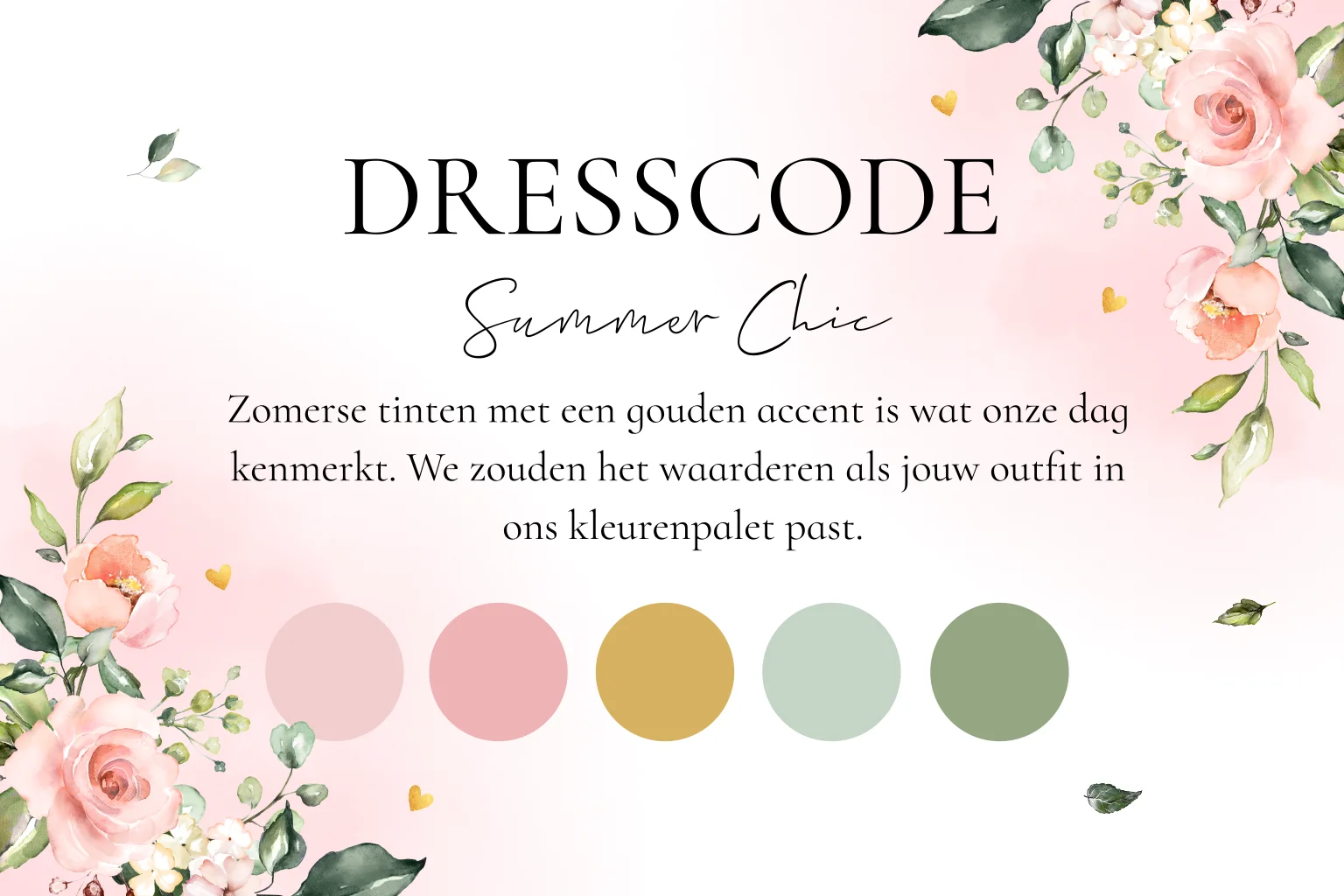 Dresscode kaartje summer chic wit rechthoekig met roze bloemen en kleurenpalet.