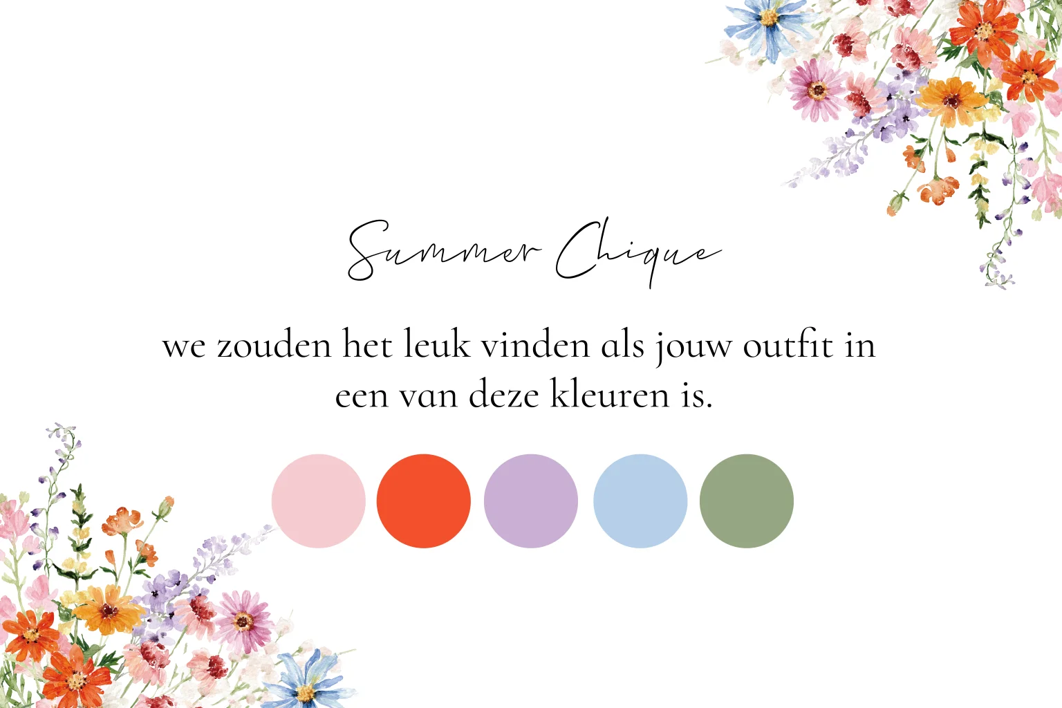 Dresscode kaartje huwelijk kleurenpalet summer chiquege bloemen