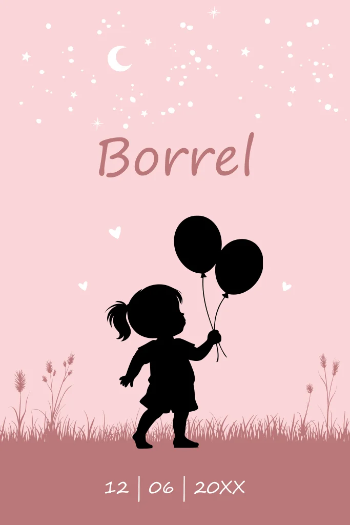 Babyborrel kaartje voor een meisje met silhouet roze en ballonnen.