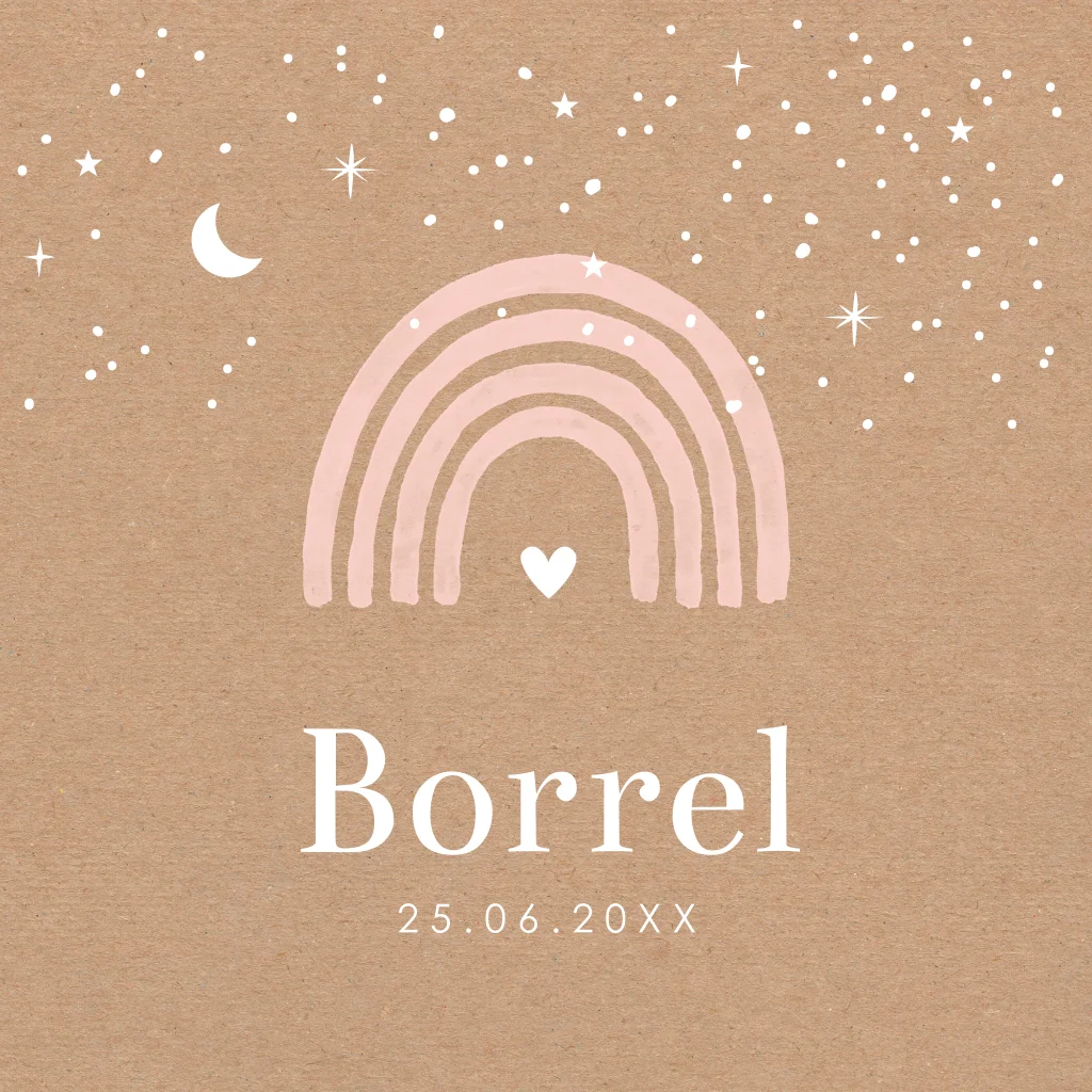 Bijpassende kraamborrelkaart voor een meisje met kraftlook achtergrond en regenboog.