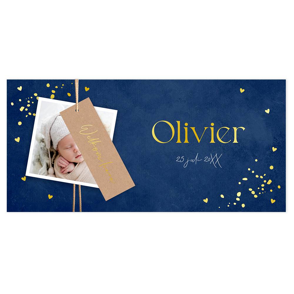 Kondig de geboorte van jullie zoontje aan met dit stoere kaartje. Het kaartje heeft een blauwe achtergrond waar de naam en geboortedatum in goudfolie op worden gedrukt. Bij het kaartje horen twee labels. Op het ene label kan een foto van jullie kleintje gedrukt worden en op het andere label een leuke tekst. Bestel snel een proefdruk om dit kaartje in het echt te bewonderen!