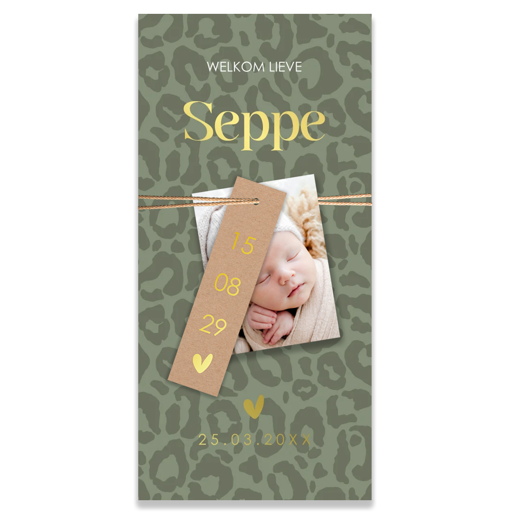 Geboortekaartje voor een jongen langwerpig groen met panterprint, fotolabel en goudfolie. Bevestig de foto met een gouden paperclip, deze zijn apart te bestellen.