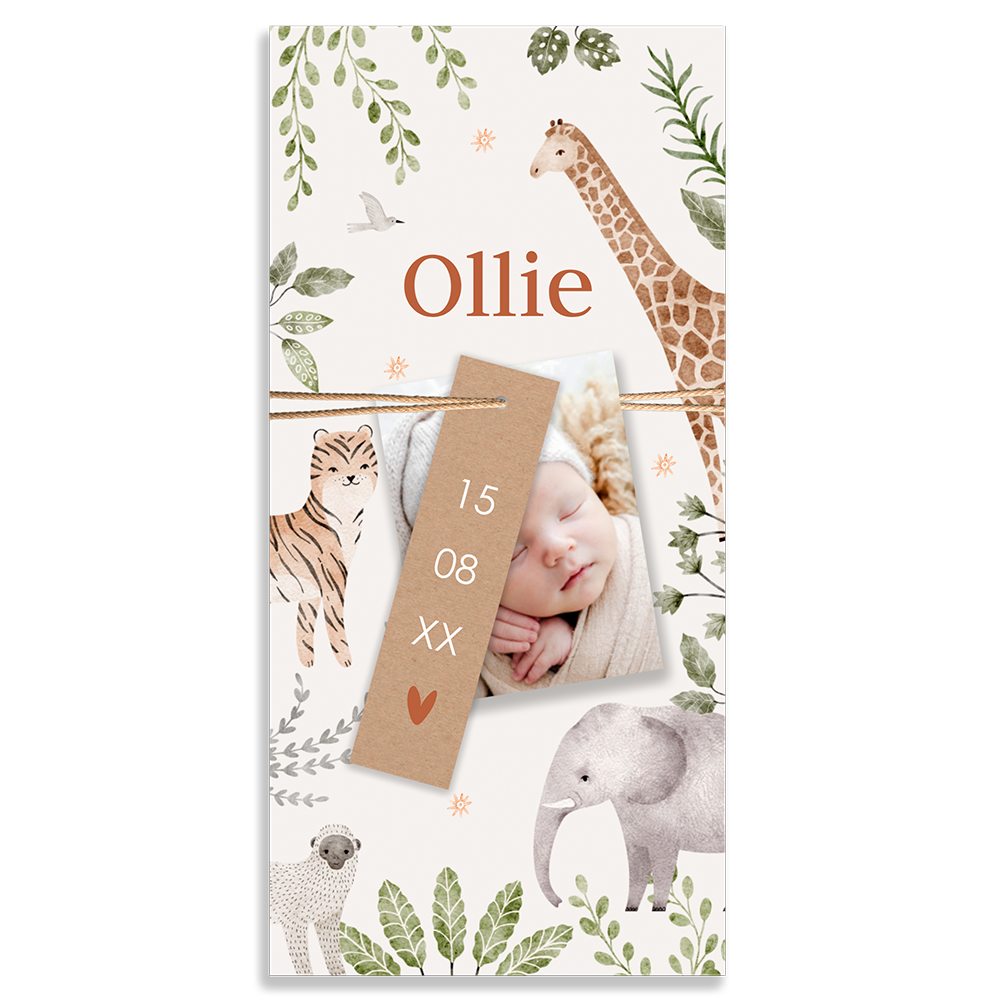 Geboortekaartje labelkaart jungle dieren langwerpig met foto. Bij het kaartje horen twee labels. Op het ene label kan een foto van jullie kleintje gedrukt worden en op het andere label een leuke tekst. Bestel snel een proefdruk om dit kaartje in het echt te bewonderen! Op het voorbeeld zijn de 2 kaarten aan elkaar vastgemaakt met een touwtje. Je kunt ook kiezen voor een leuke splitpen. Let op: omdat je kunt kiezen voor een touwtje of splitpen bestel je het bevestigingsmateriaal van jouw voorkeur los bij de kaart. Wanneer je de geboortekaartjes thuis krijgt, zet je ze hiermee zelf in elkaar. Let op: De daadwerkelijke maat van het kaartje is 21x10 cm. Let op: Deze kaart heeft een langere verzendtijd: voor 18.00 uur besteld = de volgende werkdag gedrukt en verzonden.