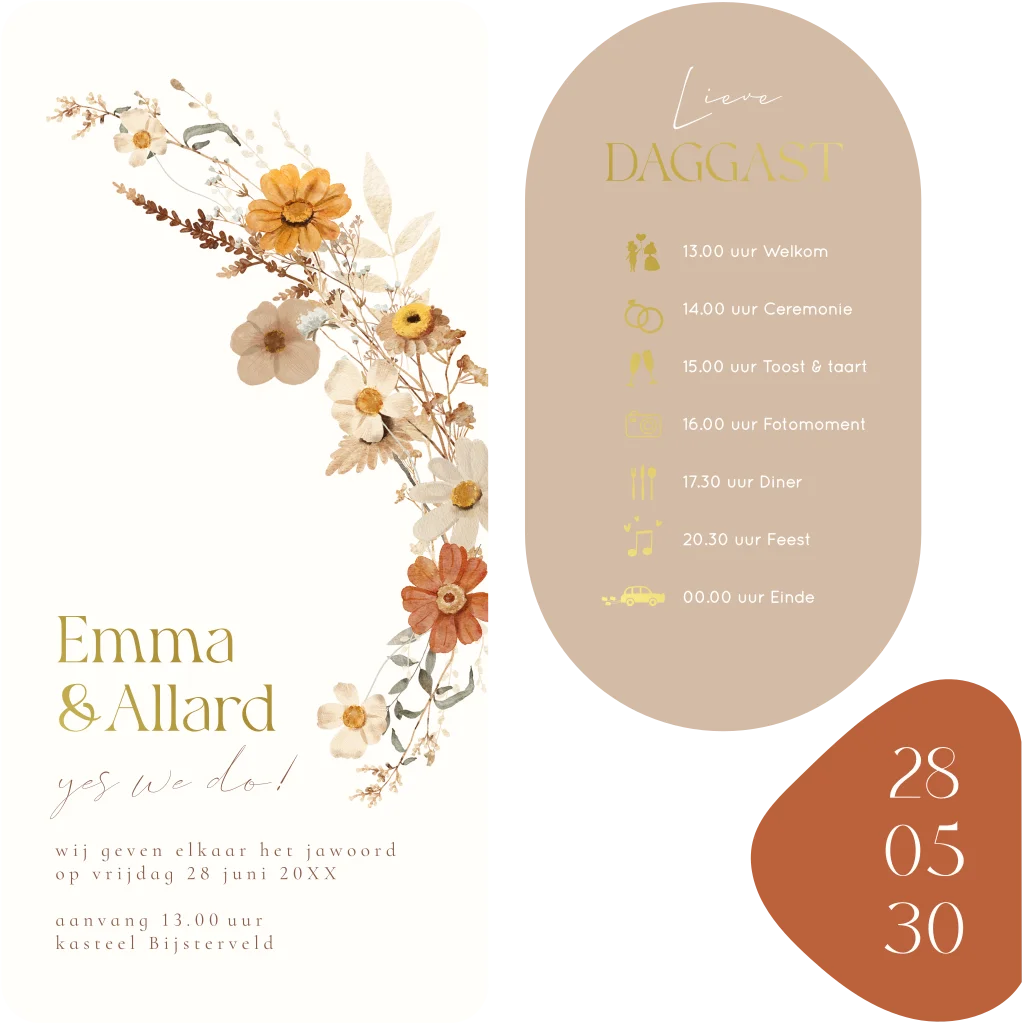 Labelkaart trouwkaart langwerpig bloemen beige bloemen goudfolie