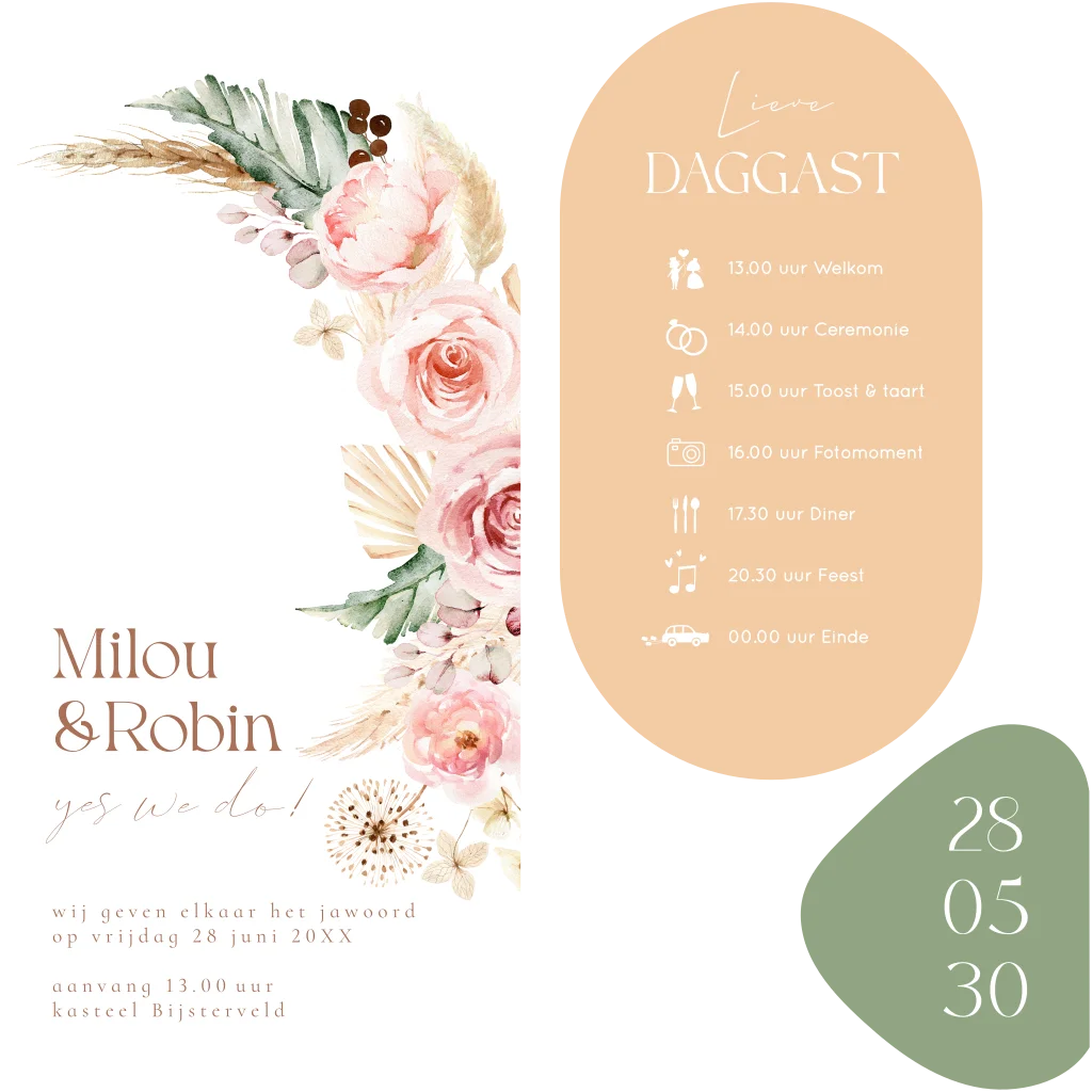 Stijlvolle labelkaart trouwkaart langwerpig met boho bloemen roze. Pas de kleuren naar wens aan!