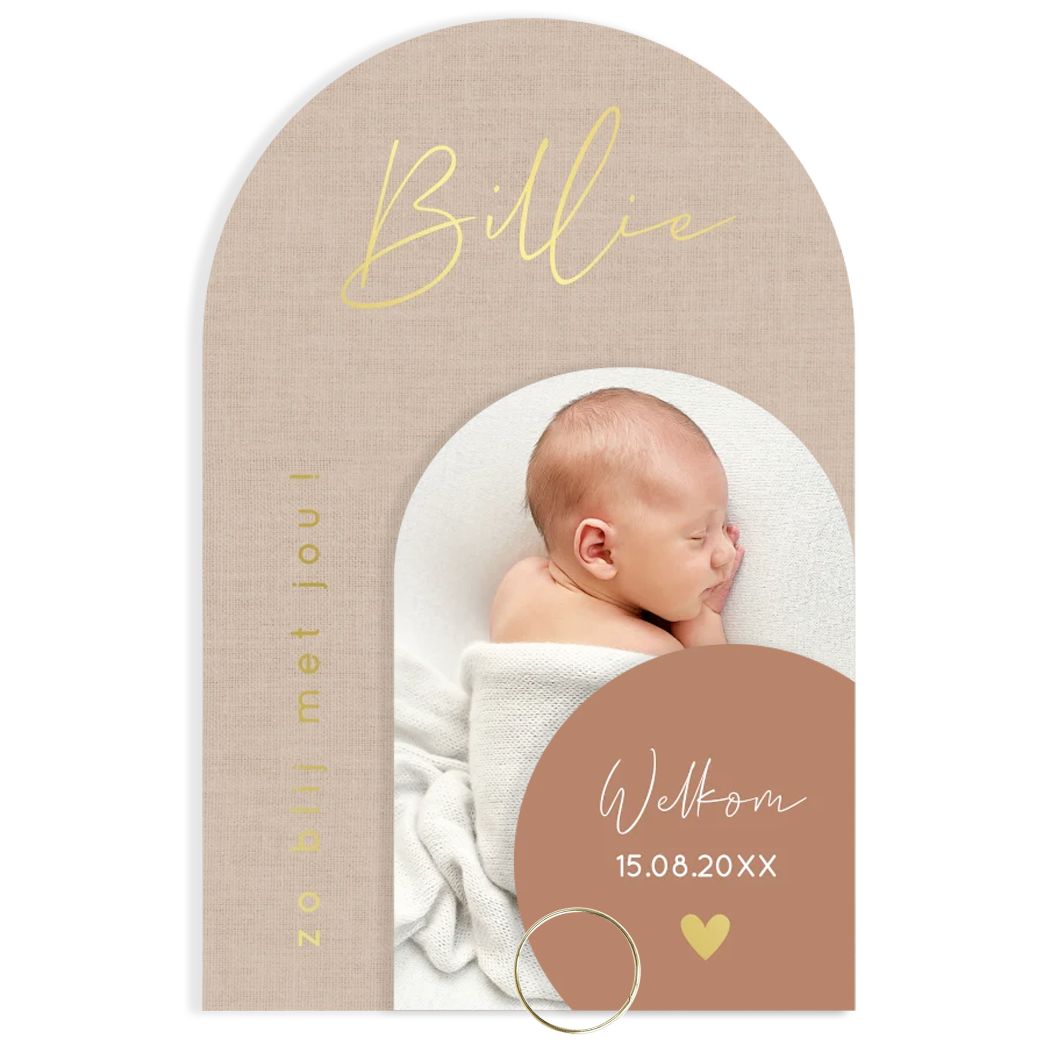 Uniek en speciaal stapelkaart geboortekaartje in boog vorm. Meerdere kaartjes en foto met luxe goudfolie. Pas de kleuren naar wens aan!