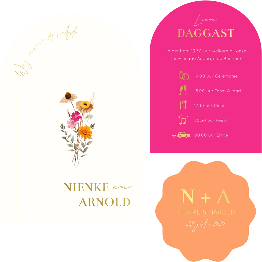 Label trouwkaart bloemenboeket kleurrijk goudfolie | 11.4 × 17.1 cm