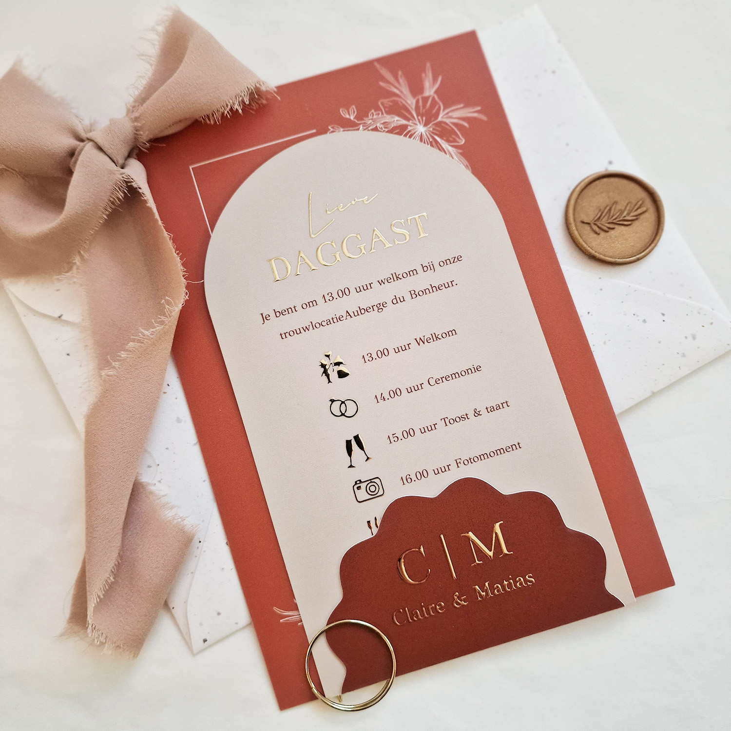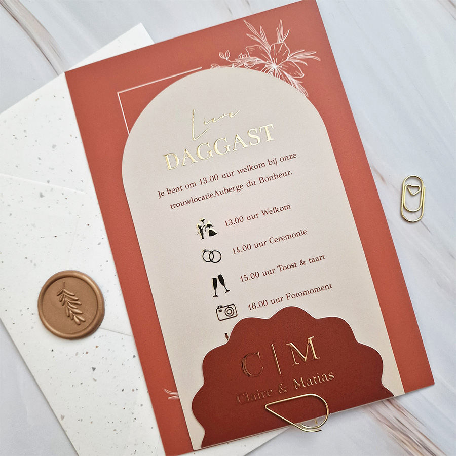 Label trouwkaart beige roestbruin met luxe goudfolie