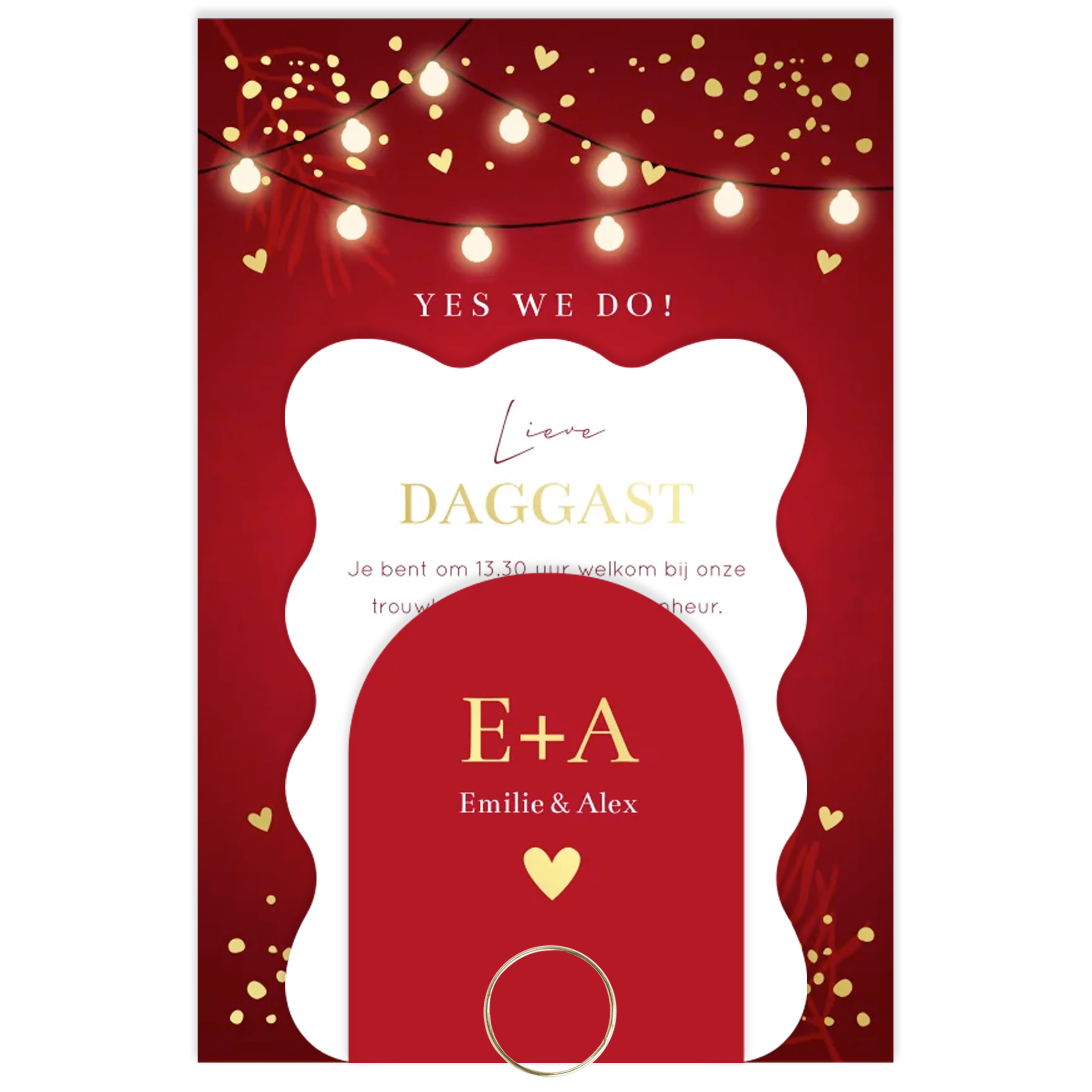 Gaan jullie binnenkort trouwen? Kies voor deze mooie kerst trouwkaart rood met labels. Jullie lievelingsfoto maakt deze trouwkaart helemaal af.