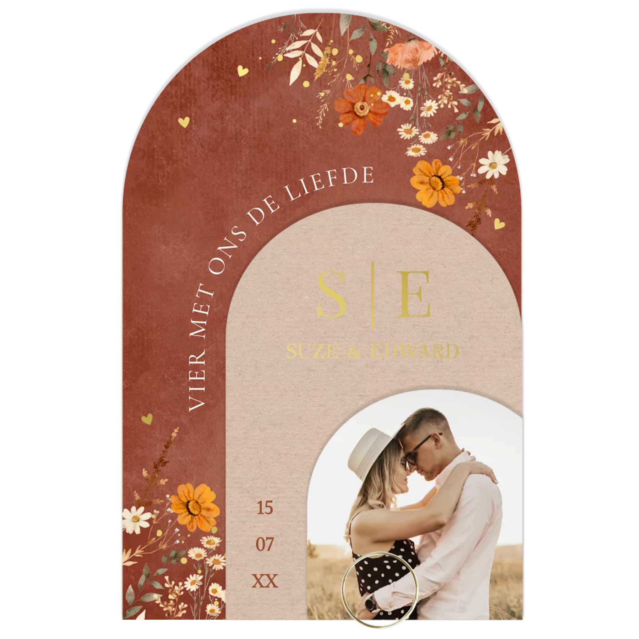 Trouwkaart stapelkaart roodbruin bloemen foto | 11.4 × 17.1 cm
