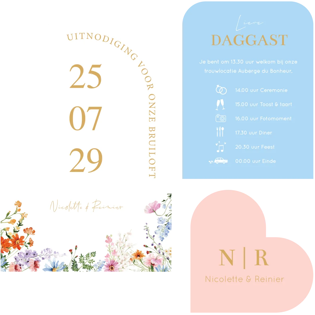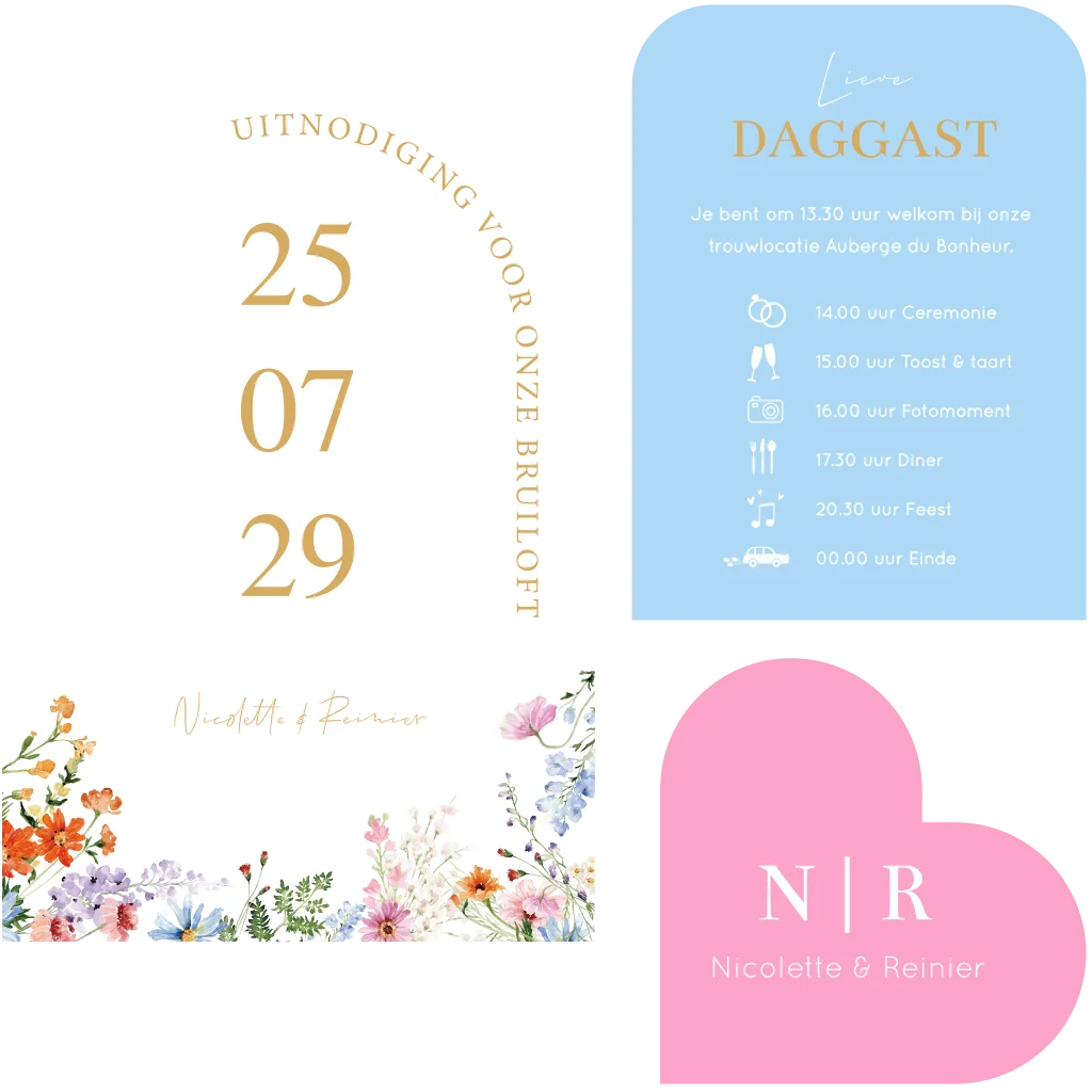 Gaan jullie binnenkort trouwen? Kies voor deze originele label trouwkaart oranje roze met labels in verschillende originele vormen. Pas de kleuren naar wens aan en bestel een proefdruk! Formaat 11.4 × 17.1 cm