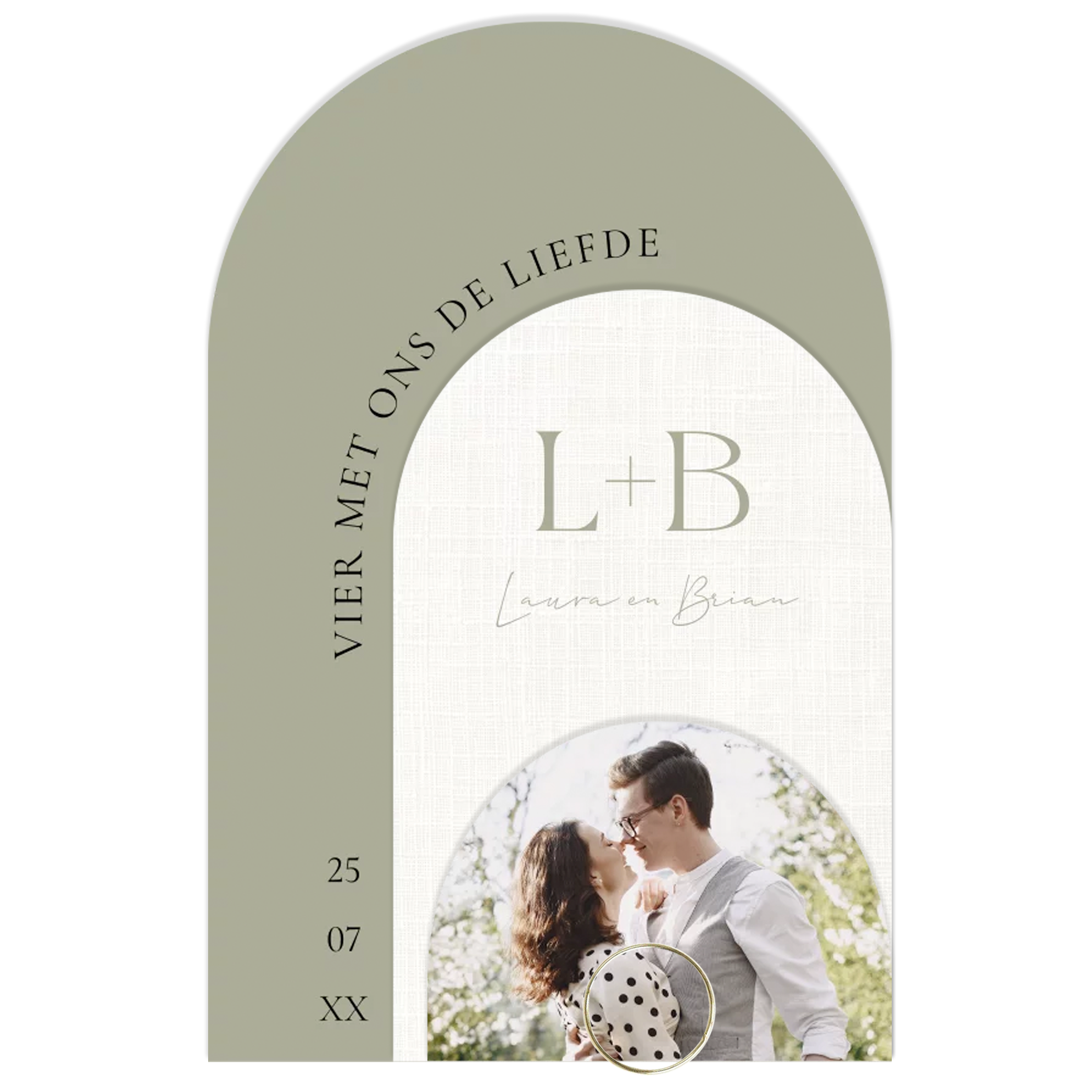 Label trouwkaart groen boog vorm modern foto | 11.4 × 17.1 cm