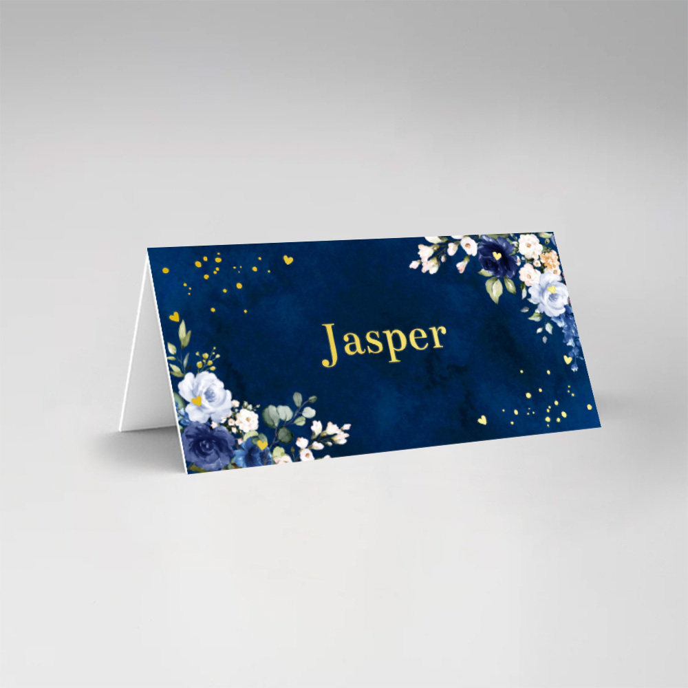 Bruiloft naamkaartjes dubbel gevouwen blauw bloemen rozen goudfolie