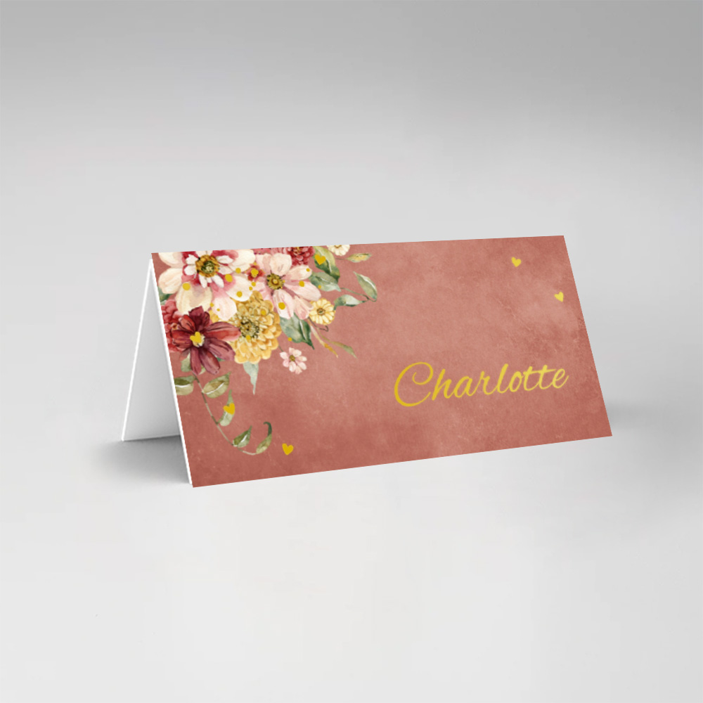 Bruiloft naamkaartjes dubbel gevouwen bloemen chic autumn goudfolie
