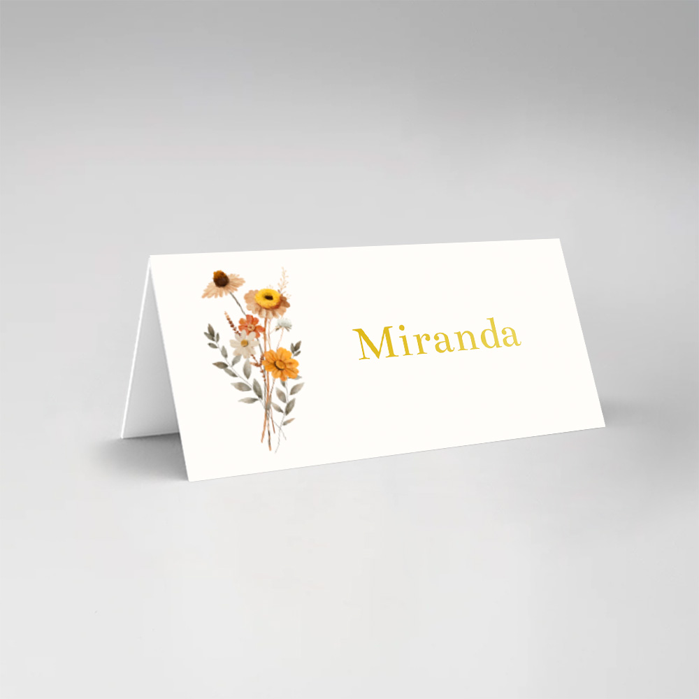 Bruiloft naamkaartjes dubbel gevouwen bloemenboeket goudfolie