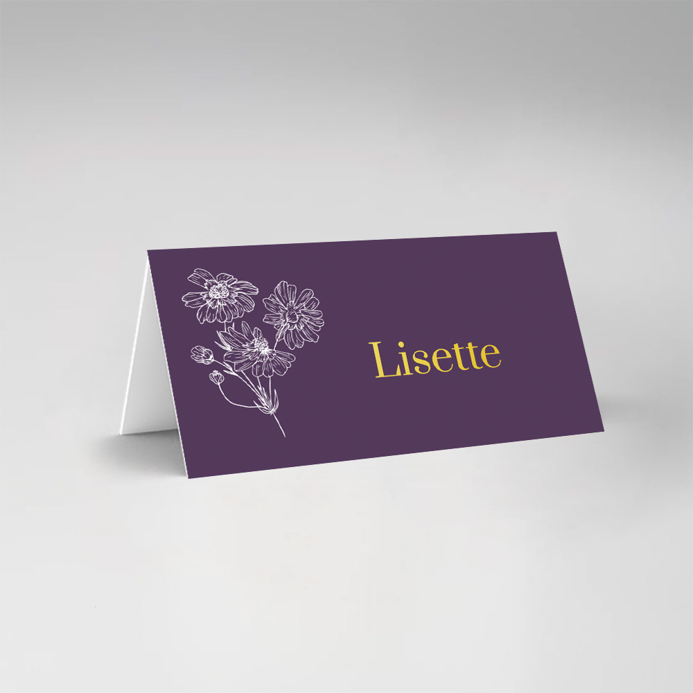 Bruiloft naamkaartjes dubbel gevouwen paars bloemenboeket goudfolie