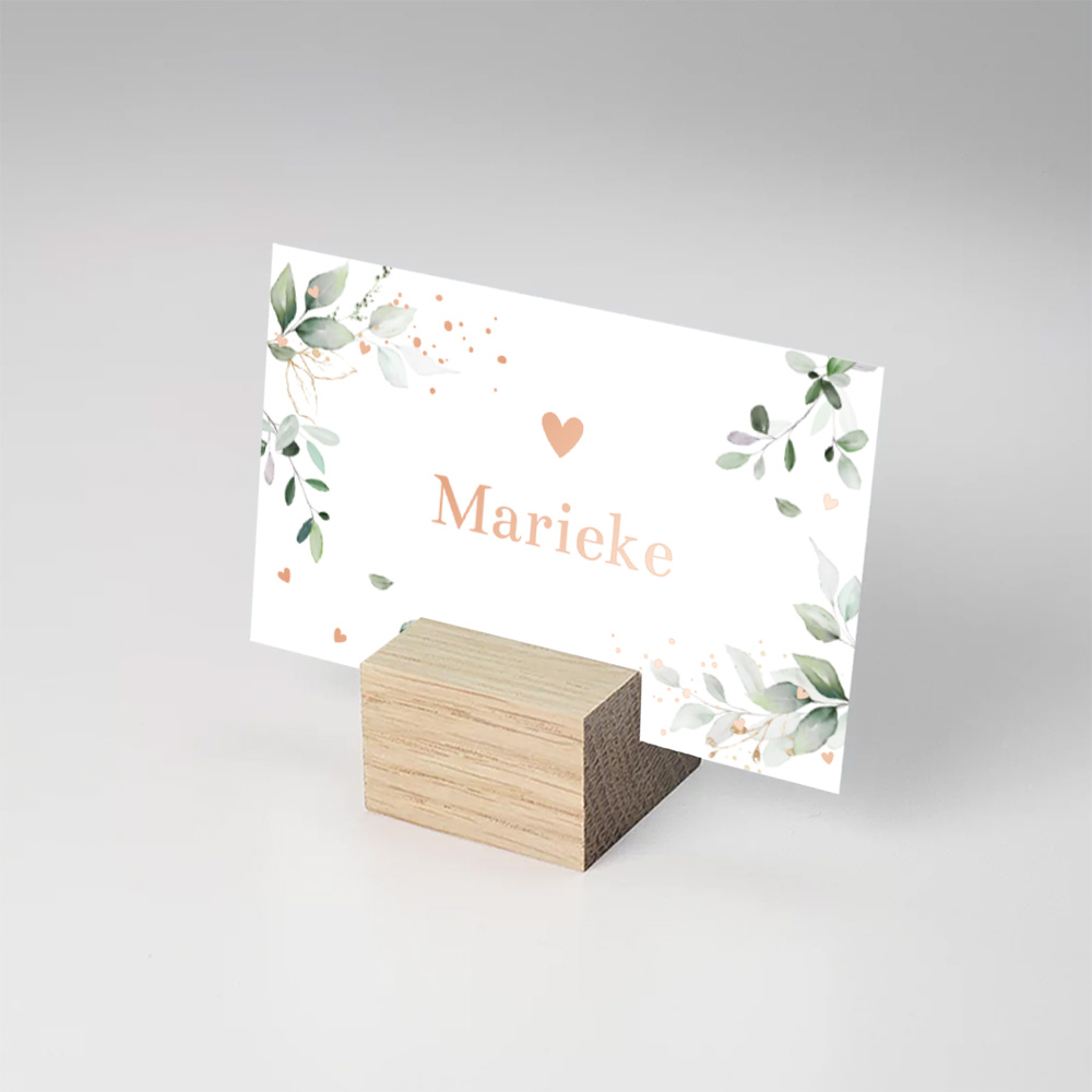 Maak jullie feest compleet en bestel naamkaartjes in de stijl van jullie kaart. Pas gemakkelijk het design zelf aan en ga aan de slag met onze editor. Voeg zo super simpel elementen zelf toe of verwijder details, die jij minder mooi vindt. Wist je dat je met een lettertype bijvoorbeeld een hele andere look kan creëren? Mocht je er niet uitkomen, neem dan gerust contact met ons op. Wij zijn er om je te helpen.