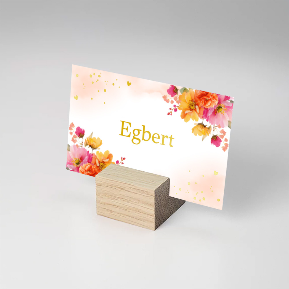 Naamkaartjes bruiloft pink orange goudfolie