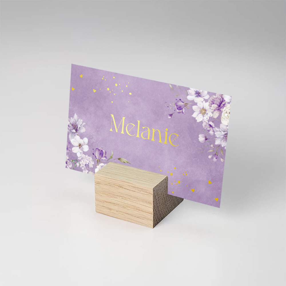 Naamkaartjes huwelijk bloemen paars goudfolie