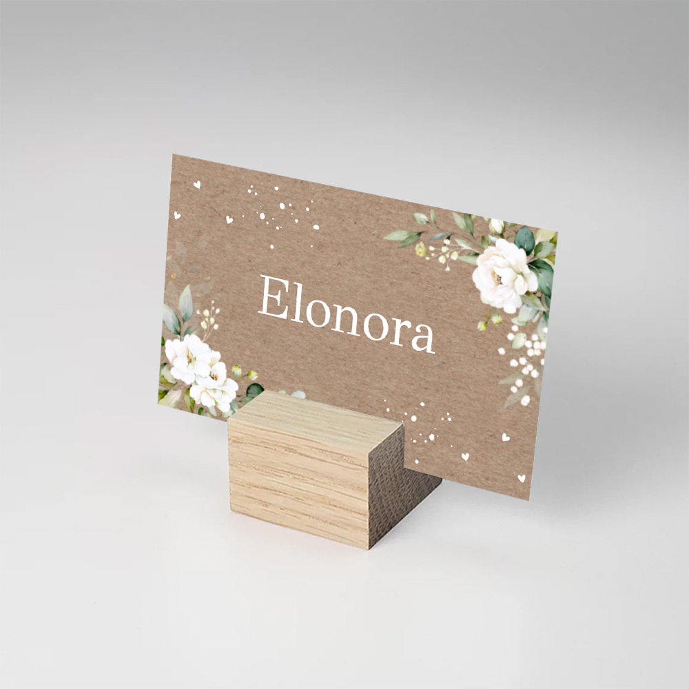 Naamkaartjes huwelijk bloemen wit kraftlook