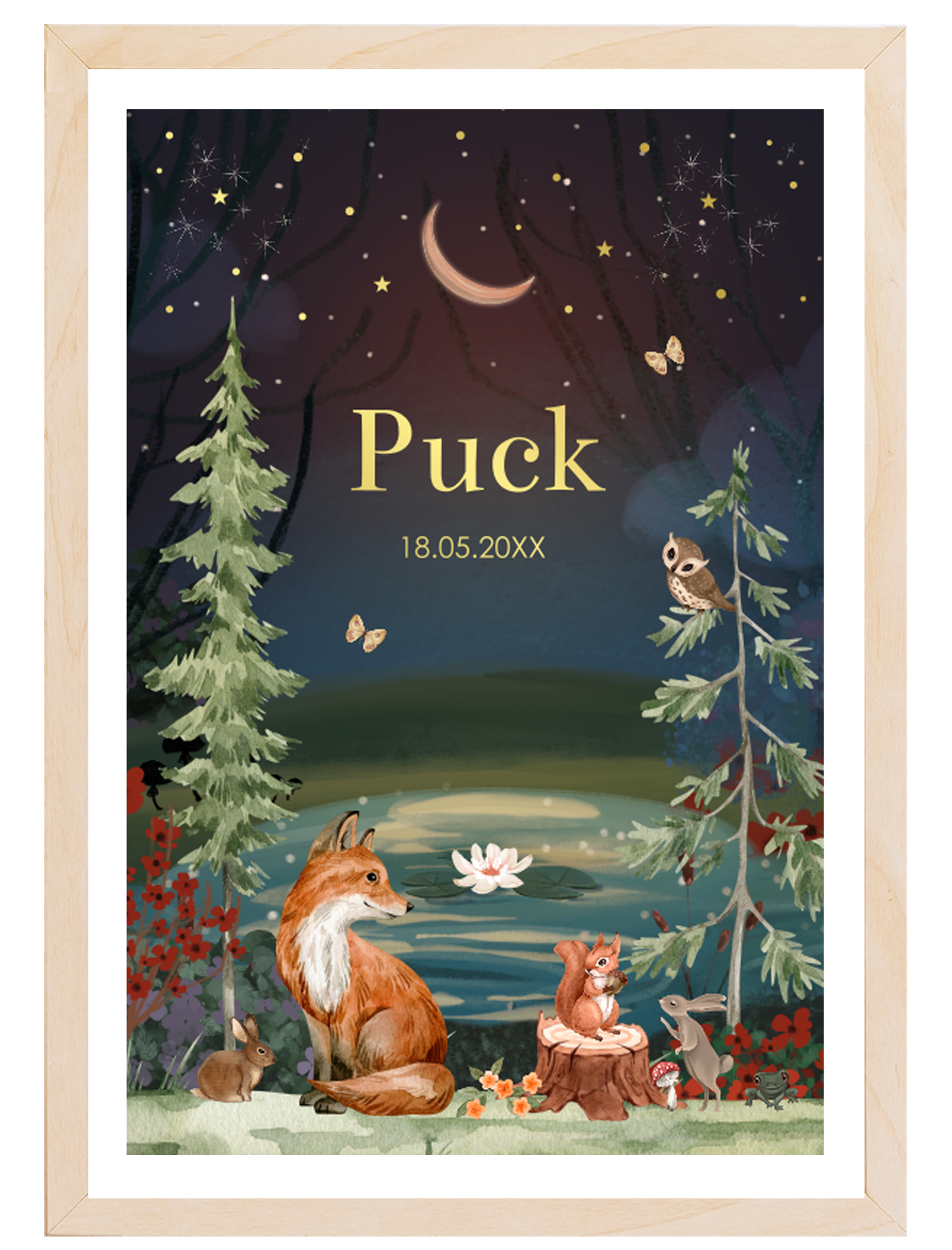 Mooie poster met thema sprookjesbos. Bomen, bosdieren, vosje, maan en sterren met naam in goudfolie.