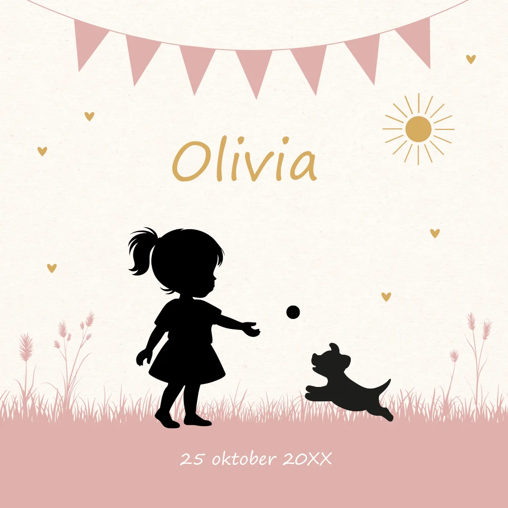 Poster geboortekaartje silhouet meisje hondje slinger roze