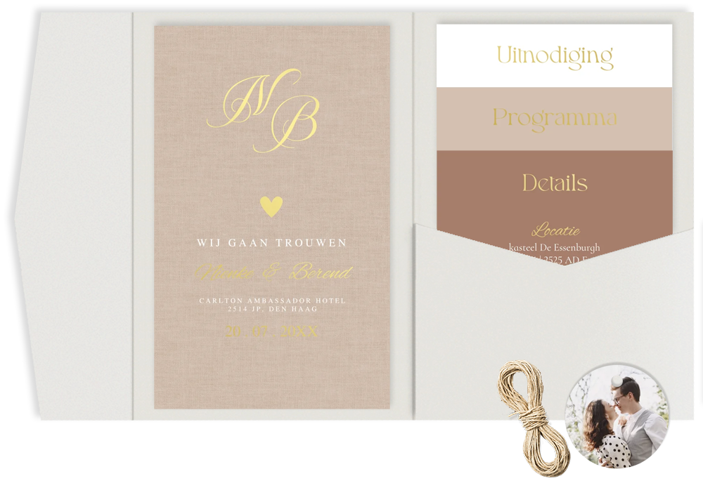 Pocketfold trouwkaart beige met luxe goudfolie. Leuke trouw icoontjes en fotolabel. Bewerk alle kaartjes overzichtelijk bij elkaar in de editor en bestel de items gemakkelijk als set.