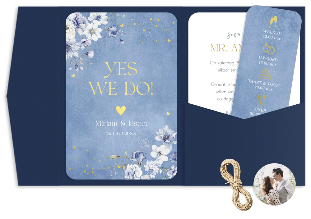 Pocketfold trouwkaart wit met watercolour bloemen blauw en goudfolie. Bewerk alle kaartjes overzichtelijk bij elkaar in de editor en bestel de items gemakkelijk als set. Een pocketfold trouwkaart: hoe werkt het? • Eén kaart plak je aan de linker binnenzijde vast • In het vakje kun je de overige losse (foto)kaartjes kwijt • Maak de pocketfold dicht met mooi lint of touw, dit kun je er los bijbestellen. De envelop wordt automatisch in de juiste maat toegevoegd aan je winkelmand bij het bestellen van de set. Good to know: 2 postzegels * Getoonde prijzen zijn excl. de pocketfolds zelf, deze kun je tijdens het bestelproces toevoegen.