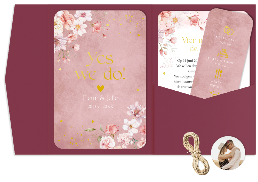 Pocketfold trouwkaart oudroze met romantische watercolour bloemen en goudfolie. Met trouw icoontjes en fotolabel. Bewerk alle kaartjes overzichtelijk bij elkaar in de editor en bestel de items gemakkelijk als set.