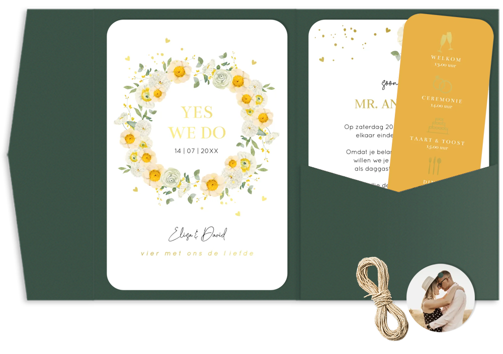 Pocketfold trouwkaart geel met watercolour bloemen geel en goudfolie. Bewerk alle kaartjes overzichtelijk bij elkaar in de editor en bestel de items gemakkelijk als set. Een pocketfold trouwkaart: hoe werkt het? • Eén kaart plak je aan de linker binnenzijde vast • In het vakje kun je de overige losse (foto)kaartjes kwijt • Maak de pocketfold dicht met mooi lint of touw, dit kun je er los bijbestellen. De envelop wordt automatisch in de juiste maat toegevoegd aan je winkelmand bij het bestellen van de set. Good to know: 2 postzegels * Getoonde prijzen zijn excl. de pocketfolds zelf, deze kun je tijdens het bestelproces toevoegen.
